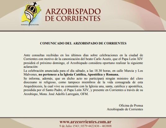 Se informa, además, que en dicho acto no participará ningún ministro del clero diocesano ni religioso, como tampoco miembros de la vida consagrada de esta Arquidiócesis, la cual vive su comunión con la Iglesia una, santa, católica y apostólica, presidida por el Santo Padre, el Papa León XIV, y presente en Corrientes a través de su Arzobispo, Mons. José Adolfo Larregain, OFM