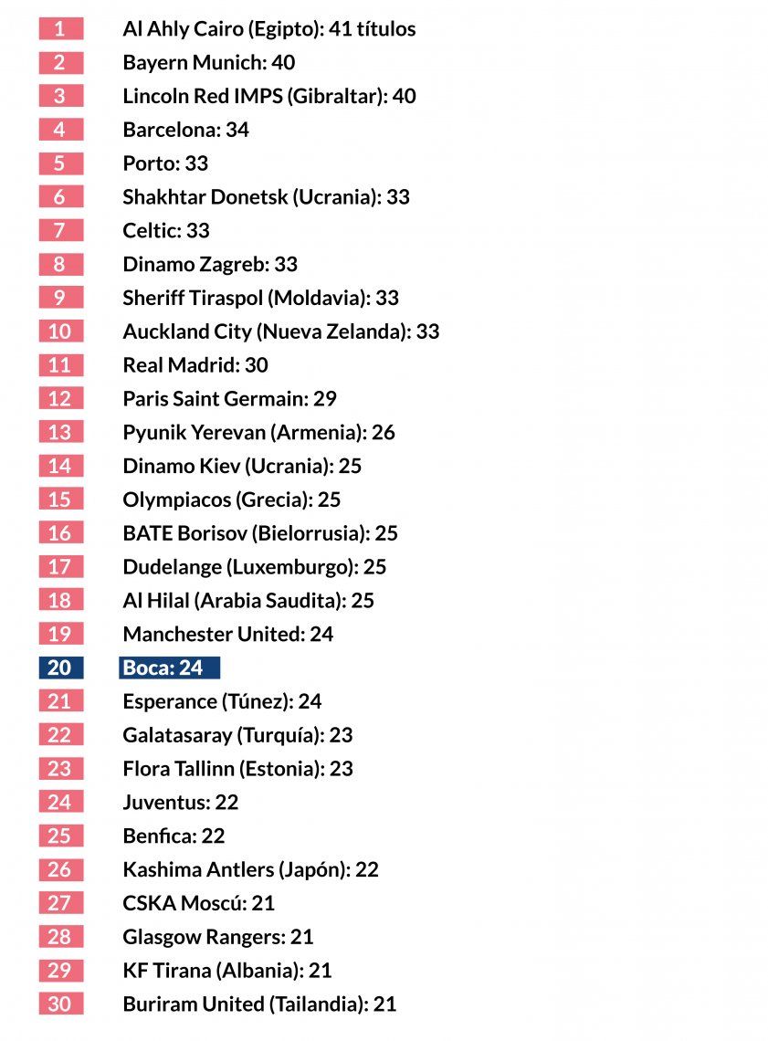 En el top 30 mundial figuran equipos de todos los continentes. El único representante de América es Boca Juniors. El Xeneize es 20º con 24 títulos en su haber. Mirá el listado completo