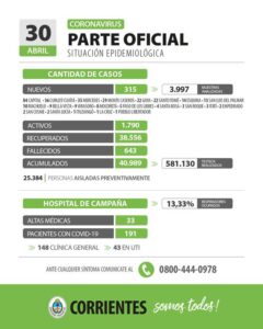 El Ministerio de Salud Pública también comunicó el parte médico del Hospital Pediátrico “Juan Pablo II” que se encuentra internado un paciente en el sector Covid. Se trata de un niño de 8 años de la ciudad de Corrientes, con leucemia, que mantuvo contacto estrecho con un familiar con diagnóstico positivo para Covid-19. El niño se encuentra estable.