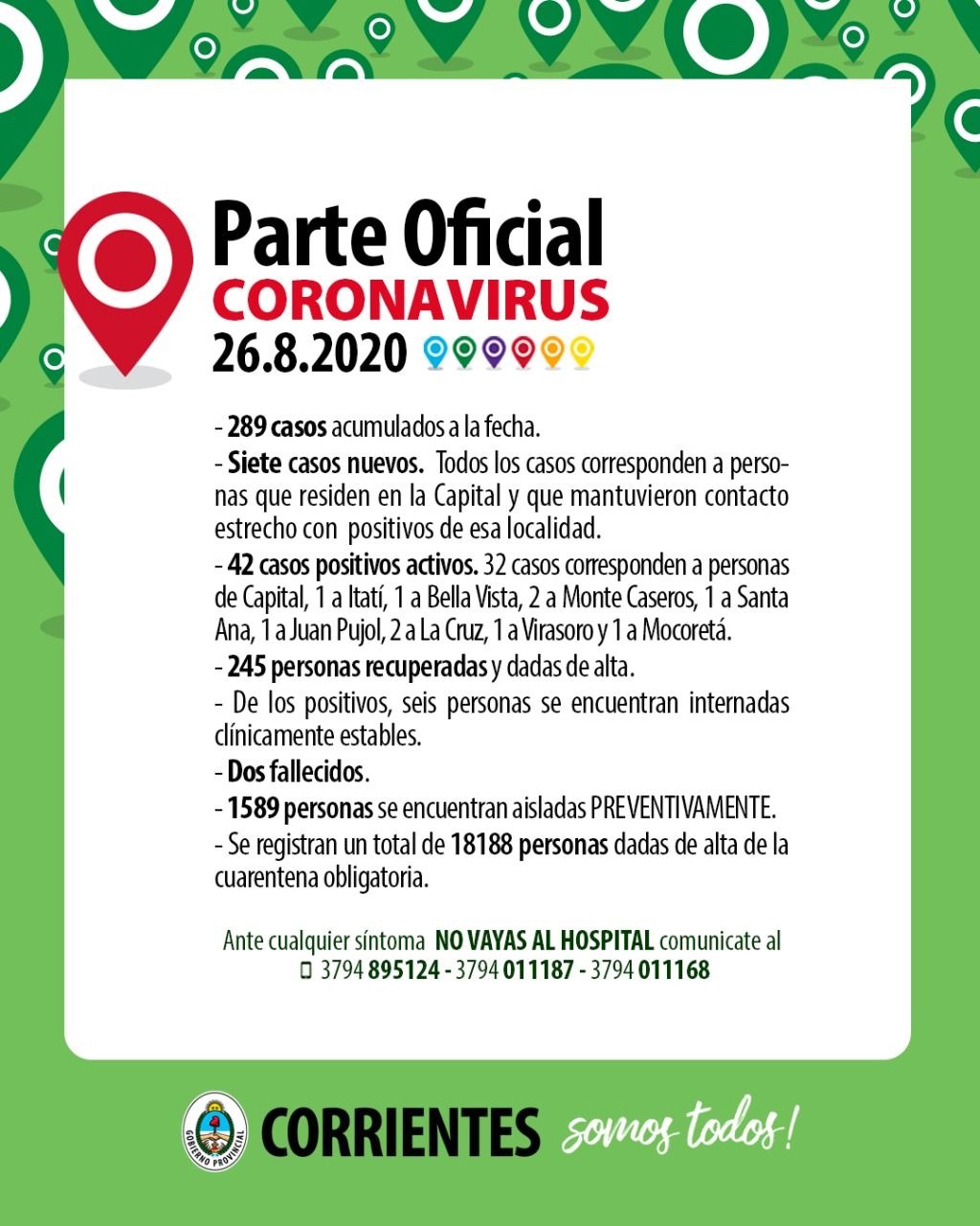 289 casos positivos por Coronavirus en Corrientes y de acuerdo al informe epidemiológico se suman hoy 7 casos y todos corresponden a Capital, donde se dieron 33 contagios en los últimos 6 días. Preocupa el brote en la principal ciudad correntina, con vínculos dispersos y variados.