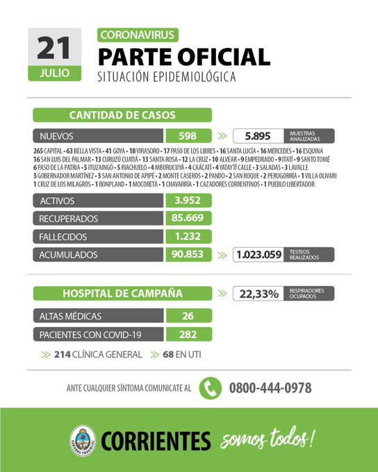 El Gobierno de Corrientes informó del fallecimiento de 11 personas con coronavirus en la provincia. Lo dio a conocer a través del parte oficial de este 21 de julio.