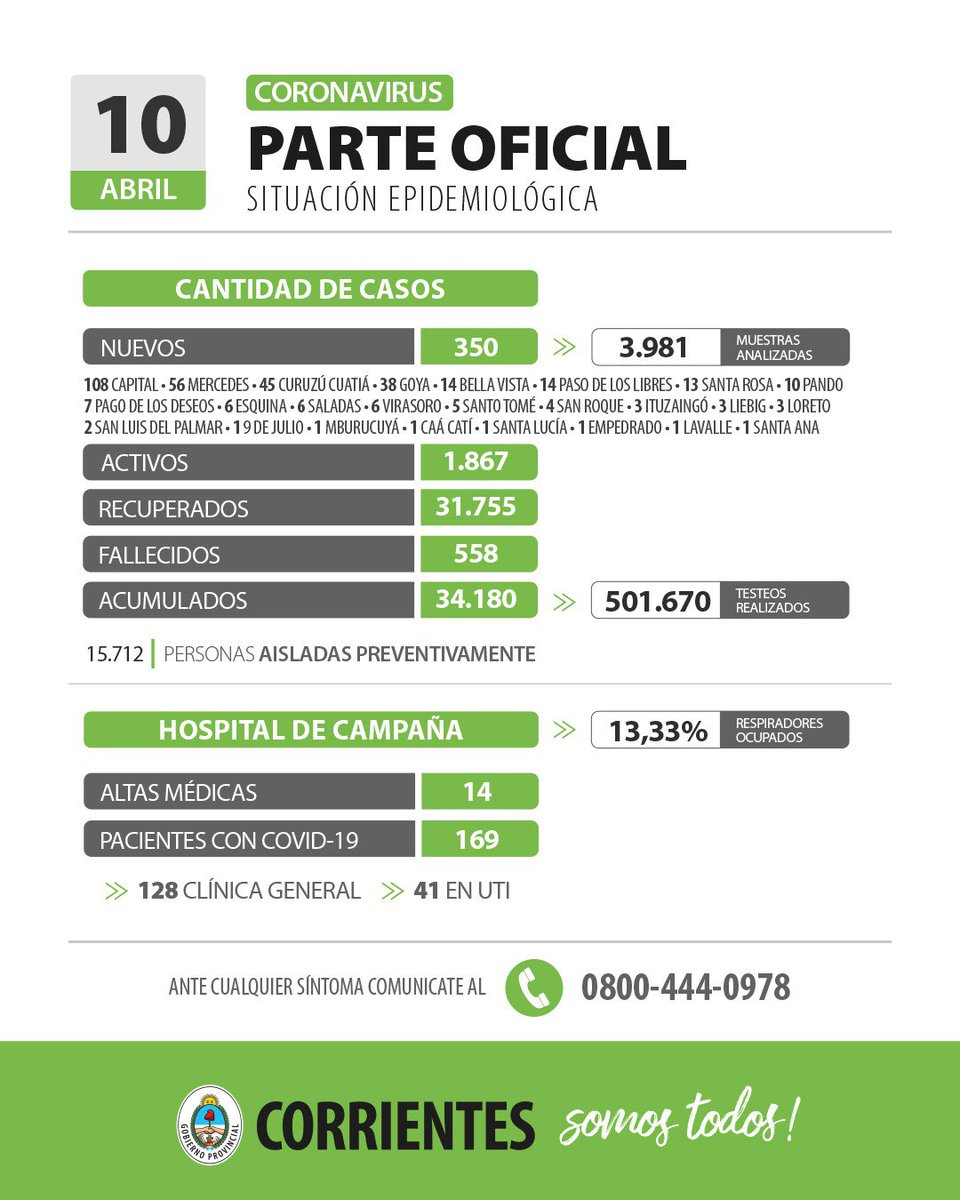 El informe epidemiológico de la provincia de Corrientes registró este sábado 350 nuevos casos positivos de Coronavirus, de los cuales 108 fueron contagios en la ciudad Capital y los 242 restantes en 24 localidades del interior provincial, al haberse analizado 3981 muestras en las últimas 24 horas.
