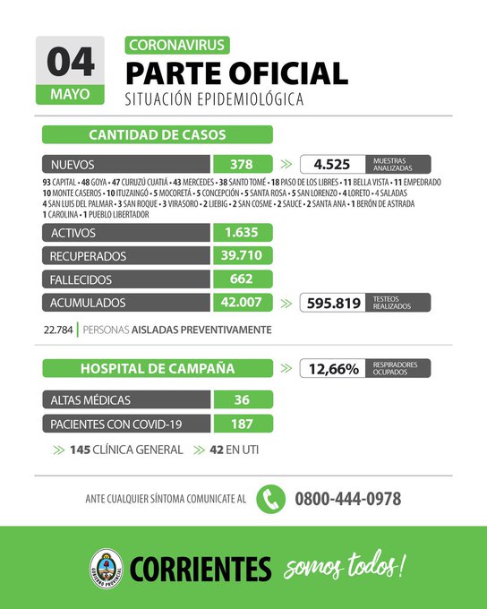 Se informó desde el Ministerio de Salud Publica este martes 4 de mayo en Corrientes 378 nuevos casos, de 4.525 muestras analizadas, de los cuales 93 corresponden a Capital en tanto que los 285 restantes se distribuyen en 25 localidades del interior provincial. De esta forma se actualiza a 1.635 los activos. Desde inicio de la pandemia ascendió a 42.007 los casos acumulados. Los fallecidos hasta la fecha son 662.