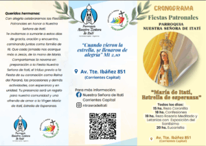Como preparación al aniversario de la Coronación Pontificia de la Virgen de Itatí, que se conmemora el 16 de julio, la parroquia llevará adelante un Triduo de oración los días 13, 14 y 15 de julio, con intenciones por la Iglesia, los migrantes y personas privadas de libertad, y por la paz mundial.