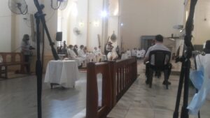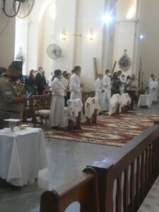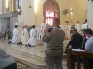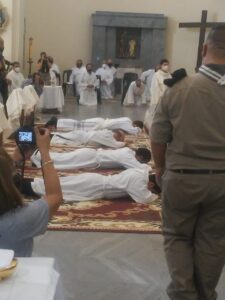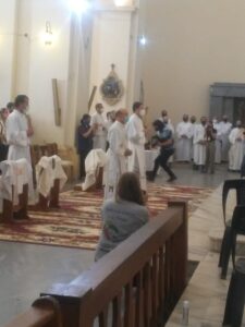 Ustedes, que serán ordenados en unos instantes más, serán ministros llamados por Dios para acompañar y guiar a su Pueblo que se encuentra atemorizado y frágil por la pandemia. Sean instrumentos que infunden confianza y alejan el miedo; promotores de solidaridad con todos, pero especialmente con los que la pasan mal; inspiradores de todo proyecto que cuide la vida humana siempre y en cualquier circunstancia, y de las iniciativas en favor del respeto al lugar que habitamos, con la conciencia de que todo esto pertenece a la causa de Dios que es también la causa del hombre. Ustedes fueron llamados por Dios para mirar todas esas cosas desde Él, tal como las reveló en la mirada y los gestos de Jesús, sobre todo, a través de su pasión, muerte y resurrección. Por eso, la celebración de la Eucaristía, deberá ser la fuente y la culminación de toda la obra evangelizadora que el Espíritu Santo tiene dispuesto realizar a través de ustedes.
