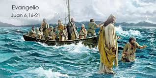 Al oscurecer, los discípulos de Jesús bajaron al mar, embarcaron y empezaron la travesía hacia Cafarnaún. Era ya noche cerrada, y todavía Jesús no los había alcanzado; soplaba un viento fuerte, y el lago se iba encrespando.